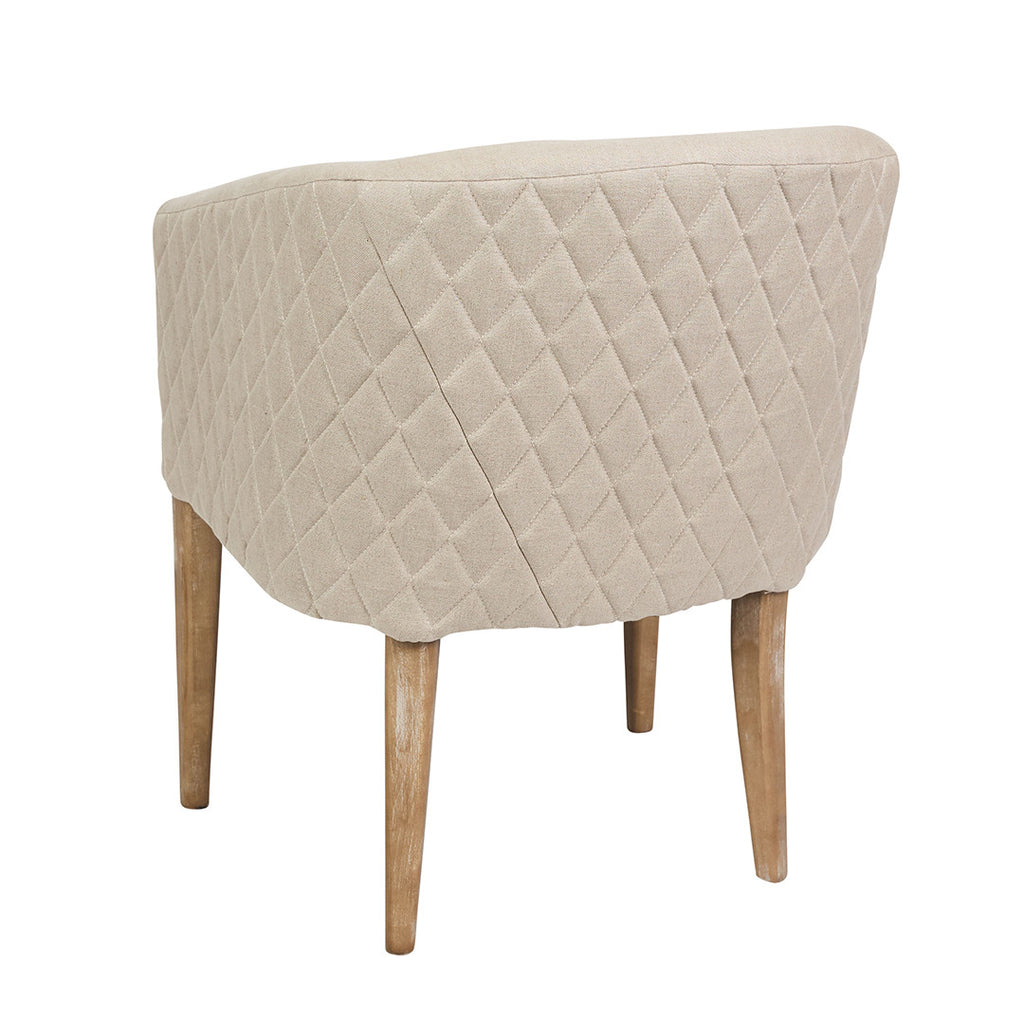 Our tub style Sloane Boutique Chair comes upholstered in a natural linen with a tapered whitewash leg & features a curved design with a modern diamond stitched back detail.