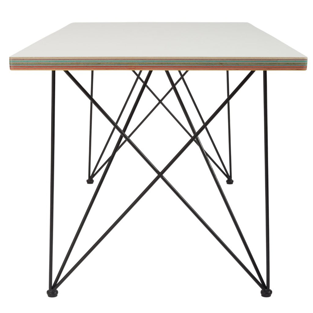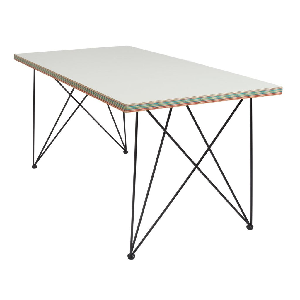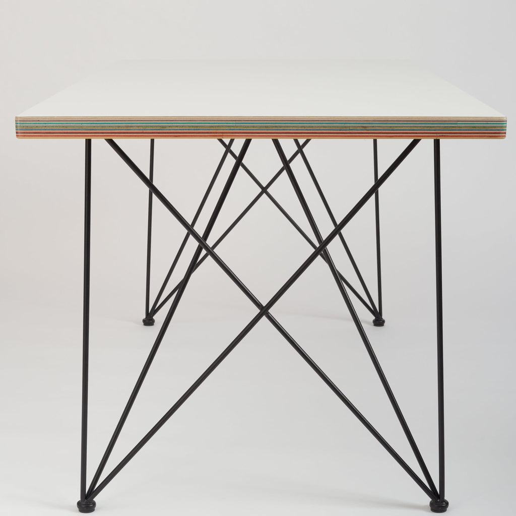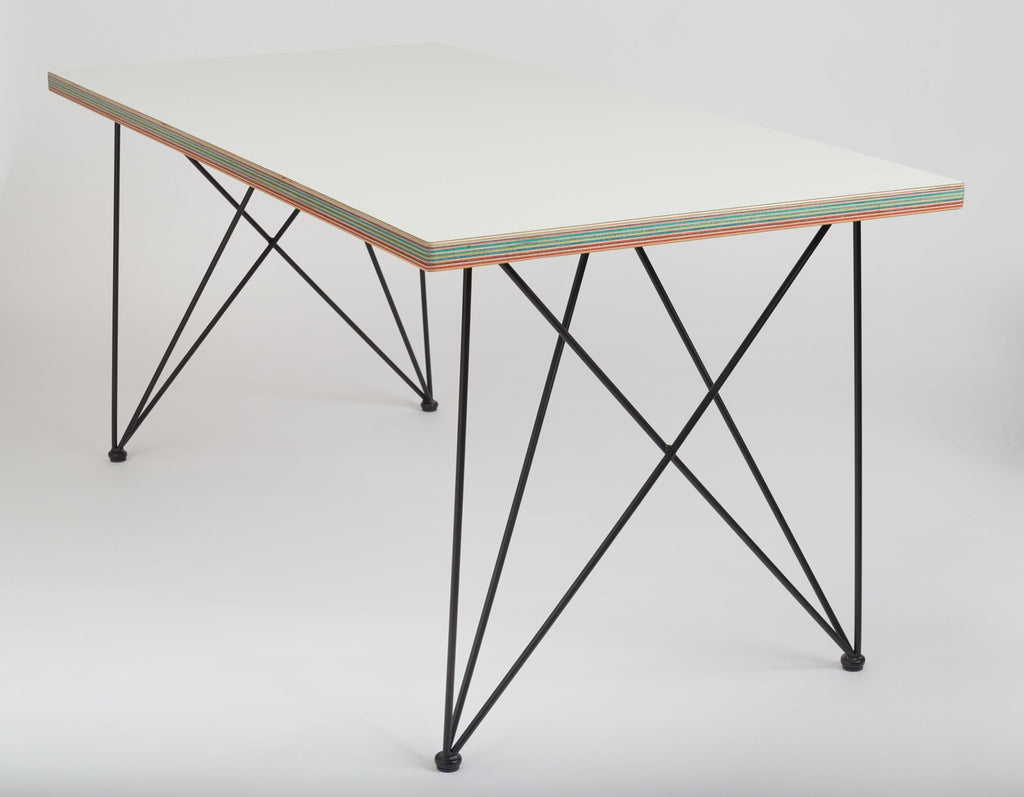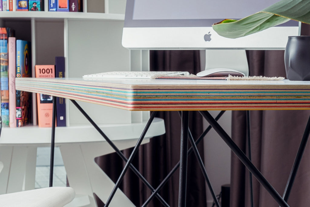 The top of this table is handmade from birch plywood and has a wear resistant HPL top layer. The colorful edges are handmade from recycled skateboards collected at local skate shops.