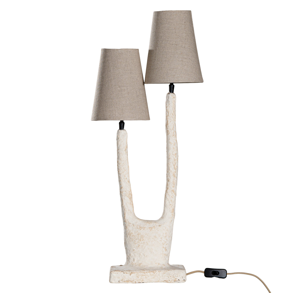 The base of this exquisite lamp is handcrafted from eco-friendly papier-maché, the shade is 100% linen, it is finished in an elegant antique mud texture, bringing a natural, artisanal aesthetic to any space.