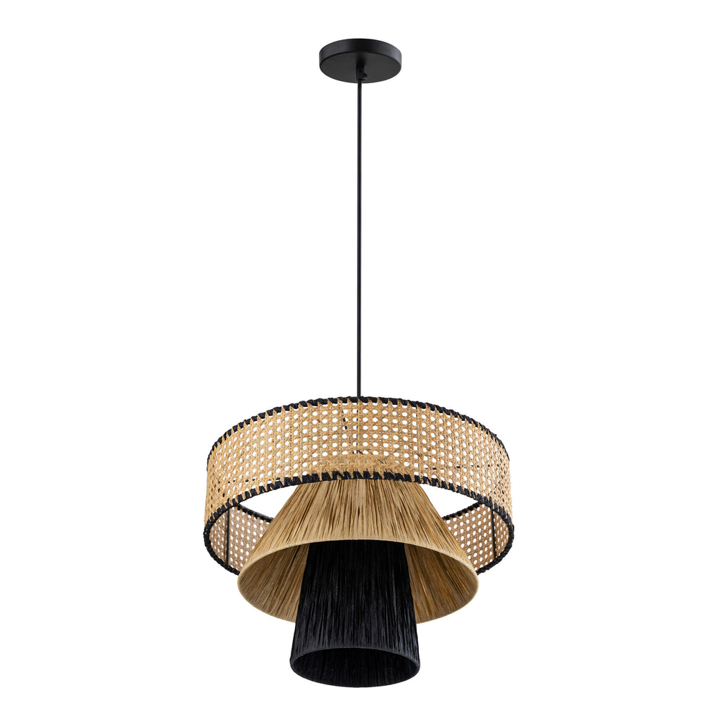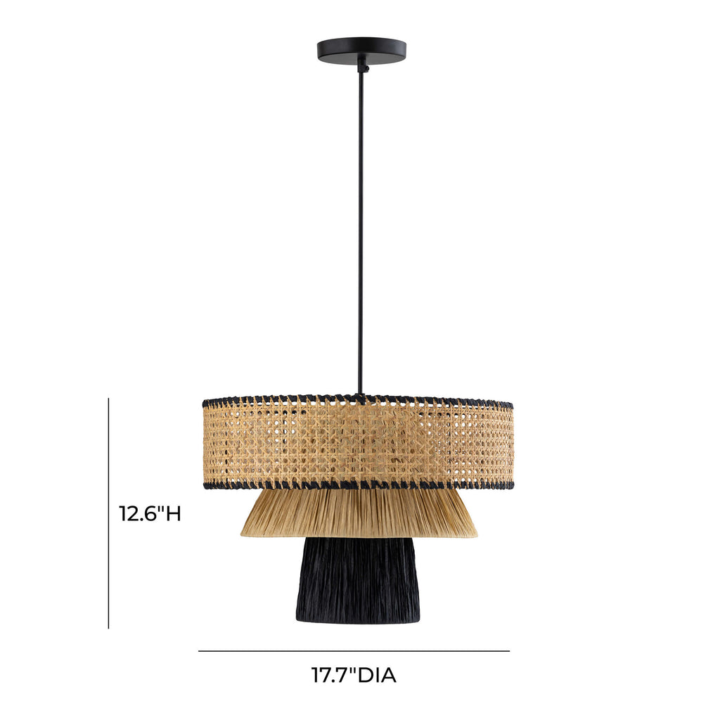 The bold design features a raffia empire shade that forms a mushroom-like cap for the tapered black "stem" of its lowest tier. An open-weave rattan ring encircles the top of the central raffia shade to complete the look. A hanging pendant light like no other, its tropical aesthetic adds rich texture to any setting.