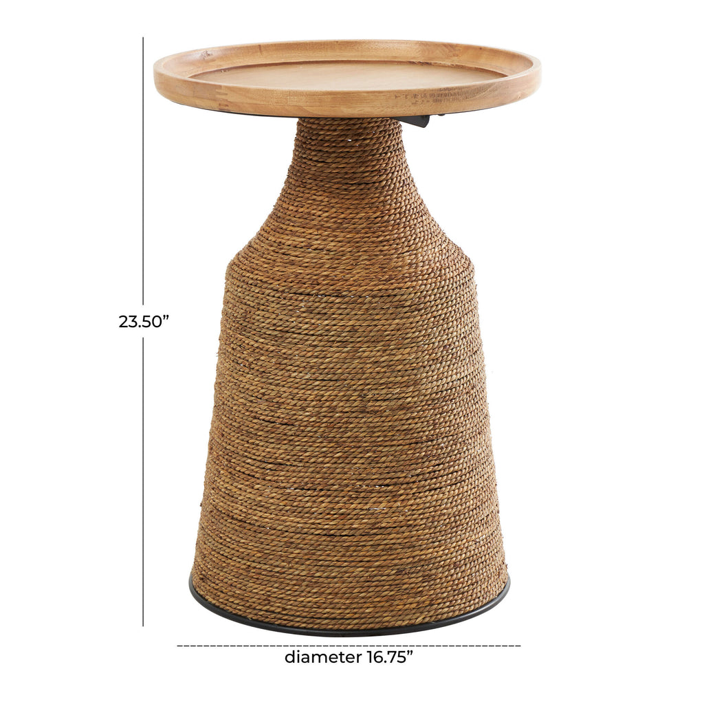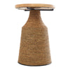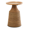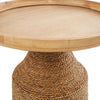 The Ranya end table features a pedestal base handwoven with textured rattan, a round tray top crafted of light-brown wood and sophisticated black-metal accents.