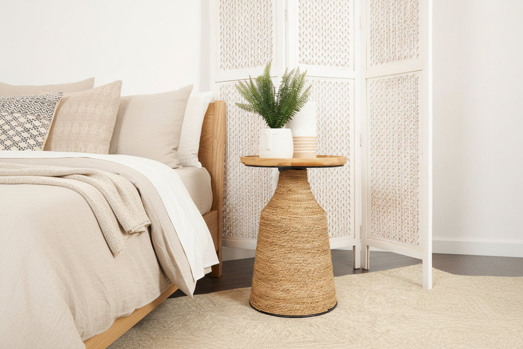 A warm and earthy accent table with a relaxed boho charm, its versatile silhouette celebrates organic materials from the natural world. The functional style of its raised-edge tabletop prevents decor, small plates, plants and accessories from slipping off the edge.