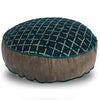 The Indienne Ayan Round Floor Cushion Cover features a playful block print geo-floral design in turquoise, champagne pink and nude, finished with a teal piping, and contrast champagne velvet pattern sides. The base is natural chambray.