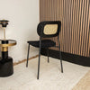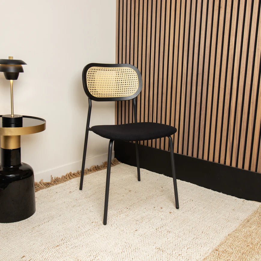 The NOSARA chair is the epitome of elegance. where tradition meets modernity. With its black corduroy seat, a natural rattan back surrounded by black wood, and a black metal structure, this chair is a true masterpiece of design and functionality.