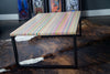 The colorful table top rests on a black powder coated steel frame, giving this product an industrial appearance. This stunning table will certainly be a conversation starter; it's a piece of art furniture that will last a lifetime.