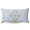 The Southampton Mayflower Outdoor Cushion Cover features a woven sky blue base with striking embroidered motifs in khaki, pearl and blue.