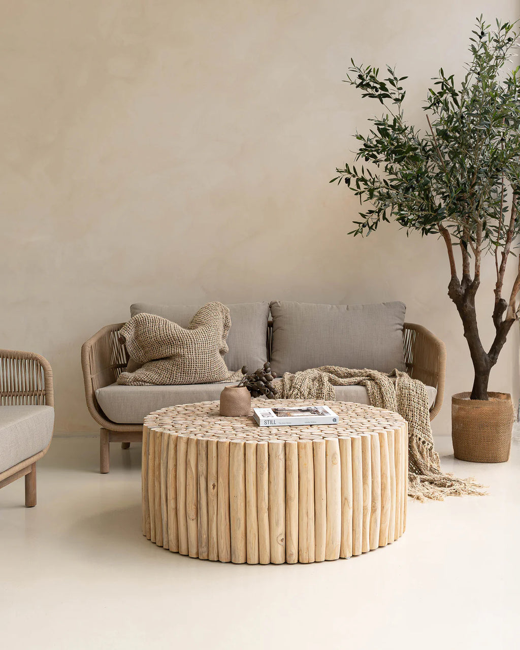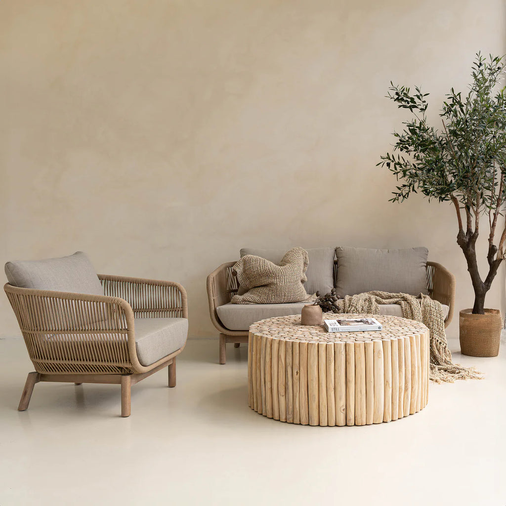 Crafted from Eucalyptus Grandis wood and featuring an aluminium frame, this piece is designed for durability. Its fishbone-style rope weaving adds texture and charm, while the plush cushions ensure a cosy and comfortable seating experience. Though suitable for outdoor use, we recommend placing the sofa in covered areas, as the cushion inserts are foam.