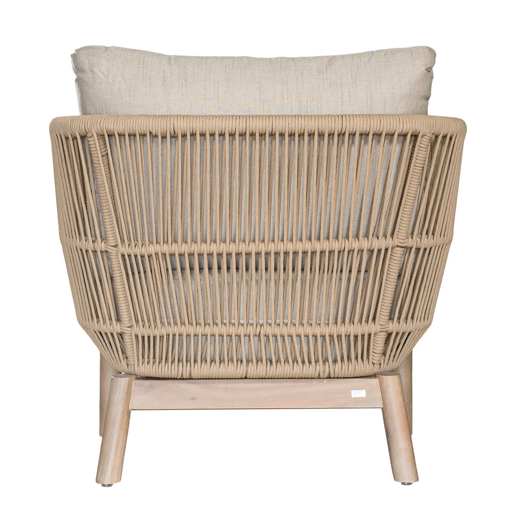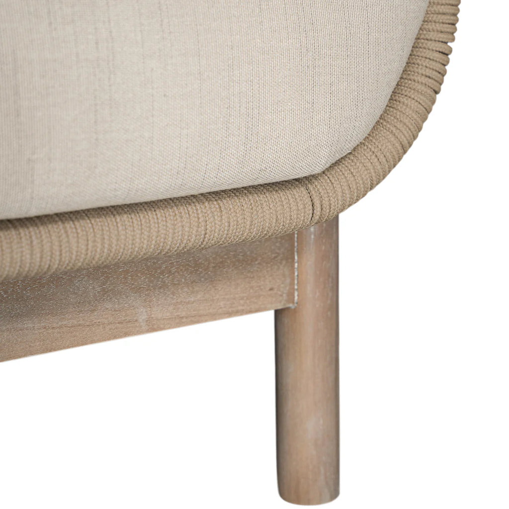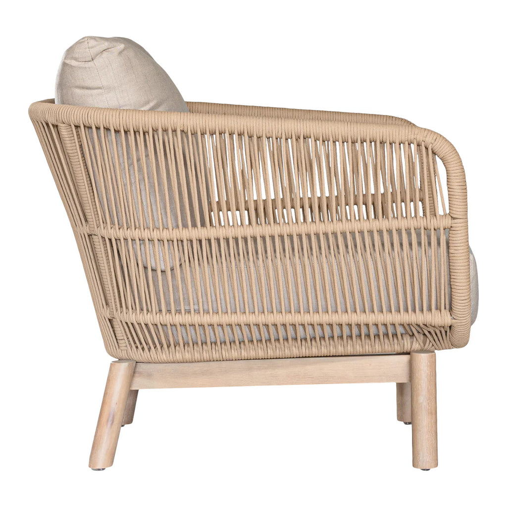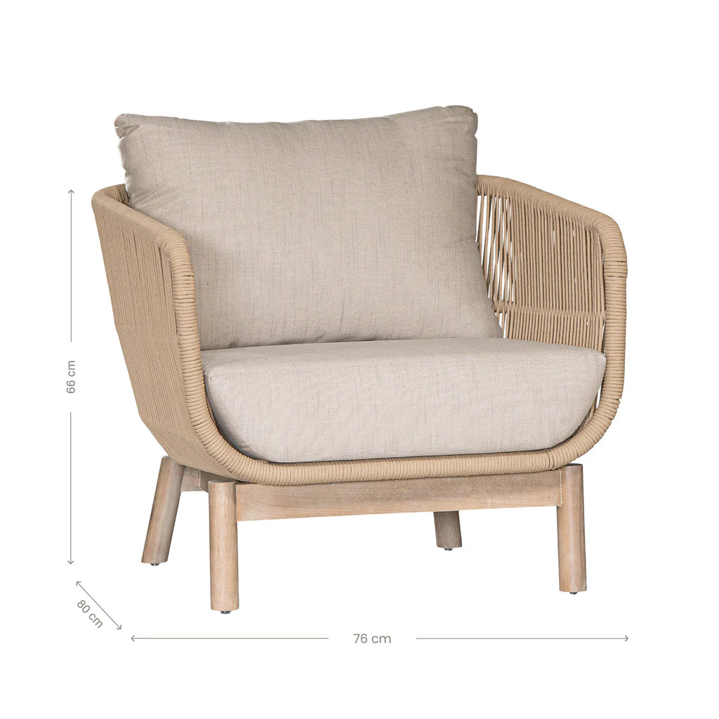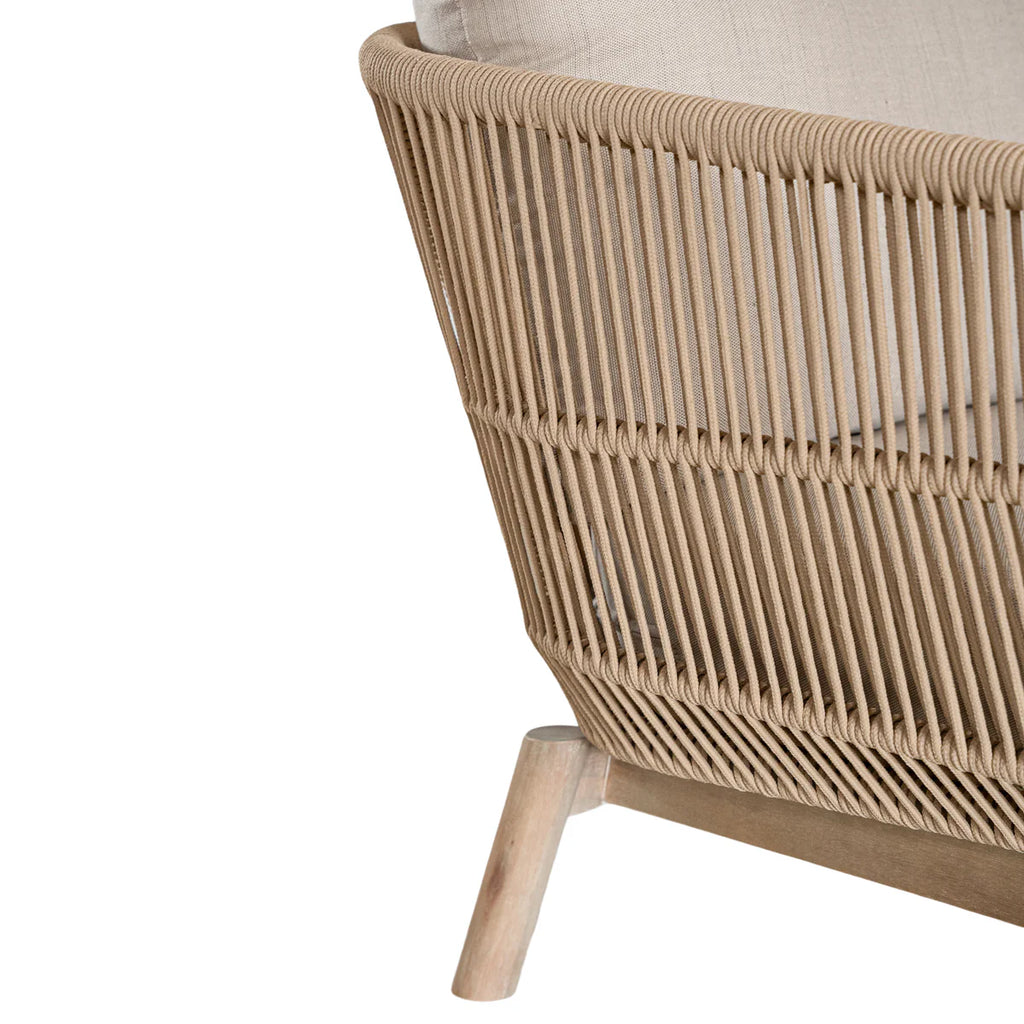 • Materials: Main Finishing: Natural rope with a fishbone weave. Seat Composition: Cushions with foam insert. Frame Construction: Aluminium frame with Eucalyptus Grandis wooden legs featuring premium aluminium hardware for added strength and durability.