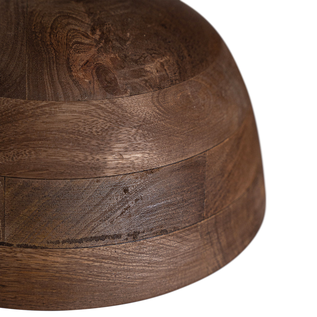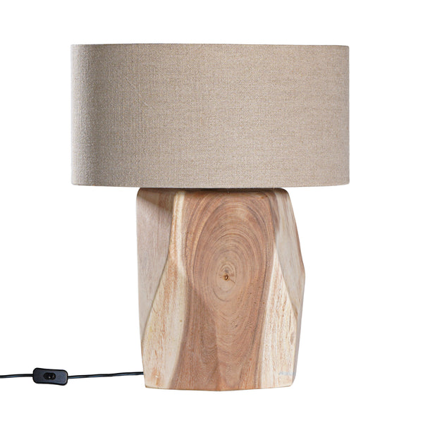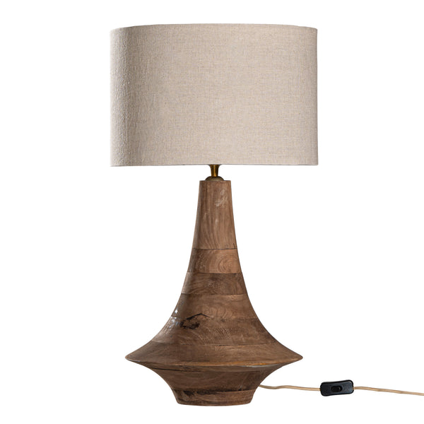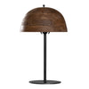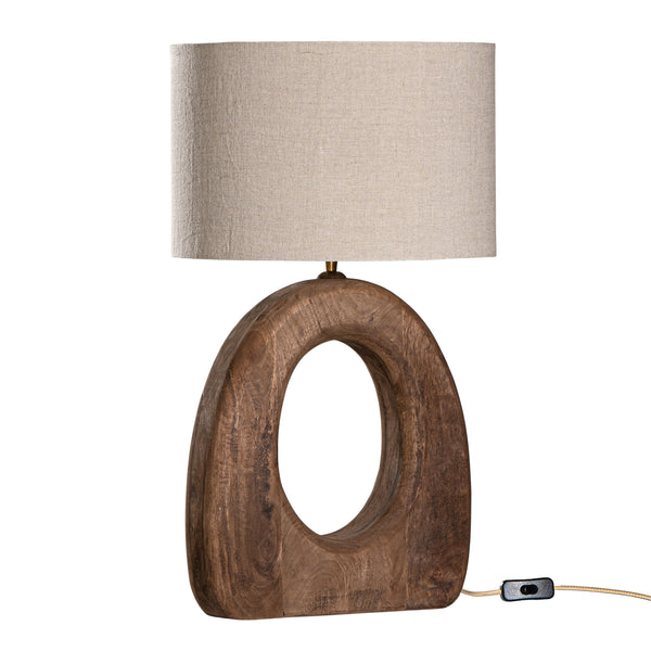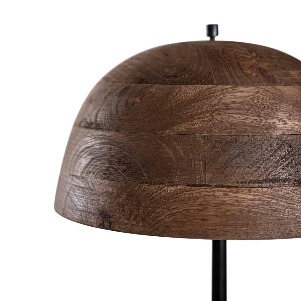 The shade is handcrafted from antique brown mango wood, the base is iron.