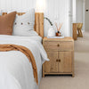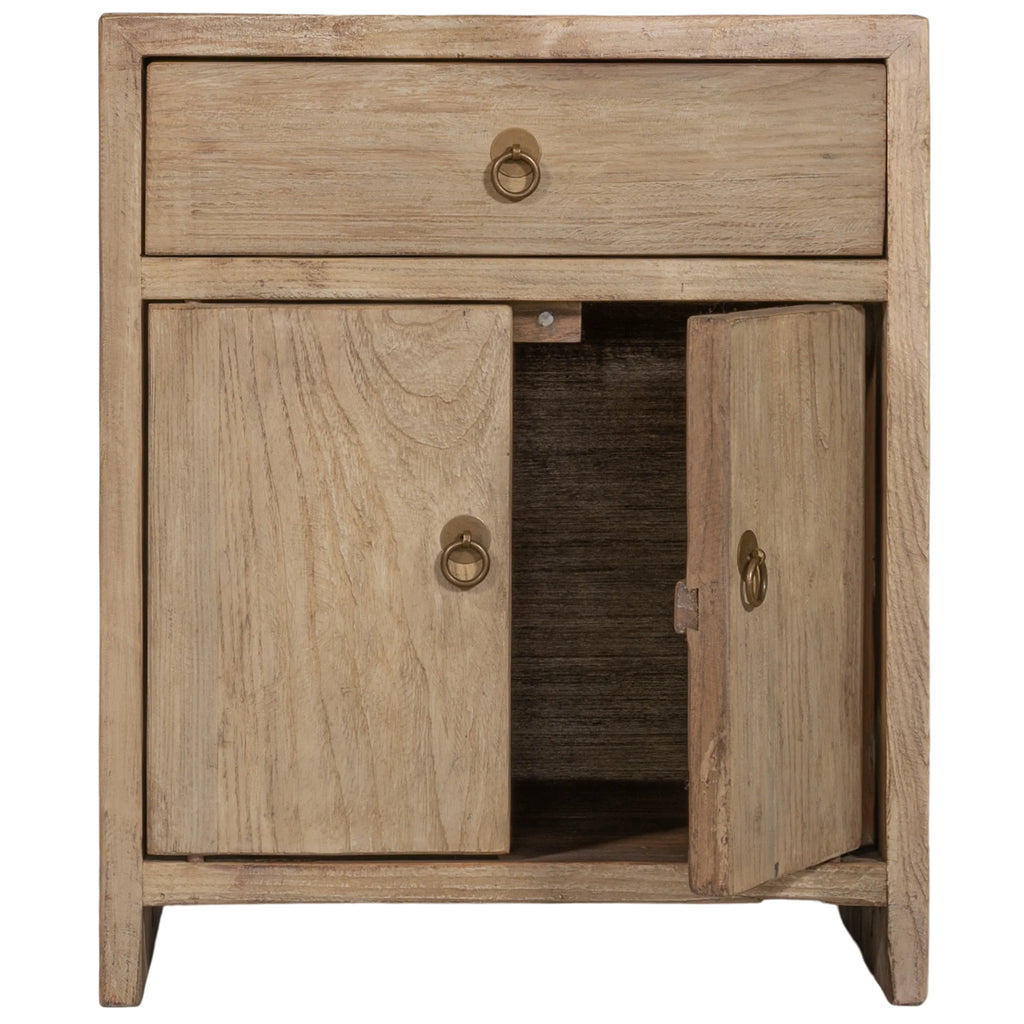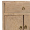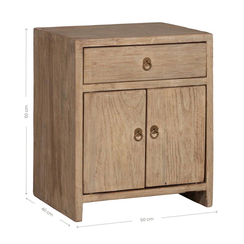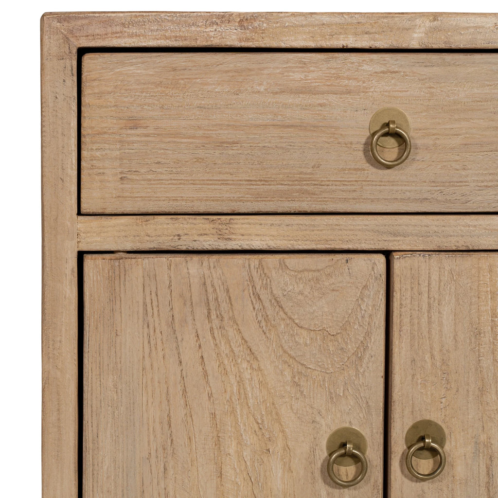 Designed for both storage and style, this piece features clean lines, a natural character, and antique brass handles. Variations in tone and markings reflect the timber’s history, enhancing its unique appeal.