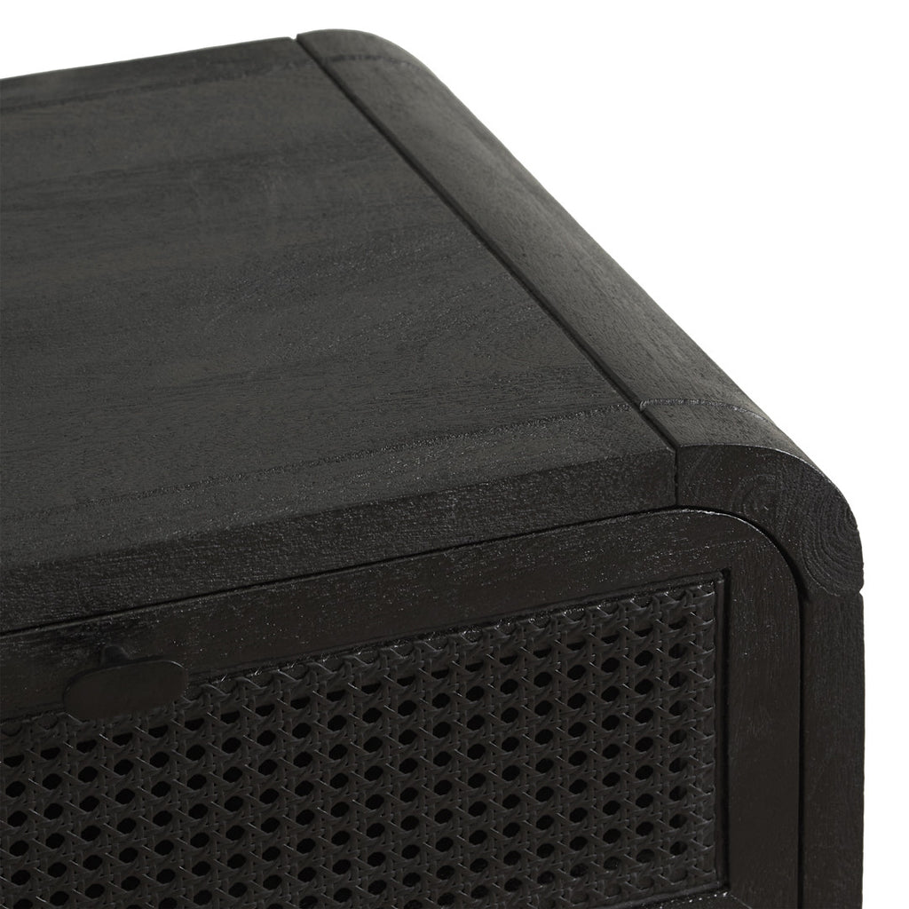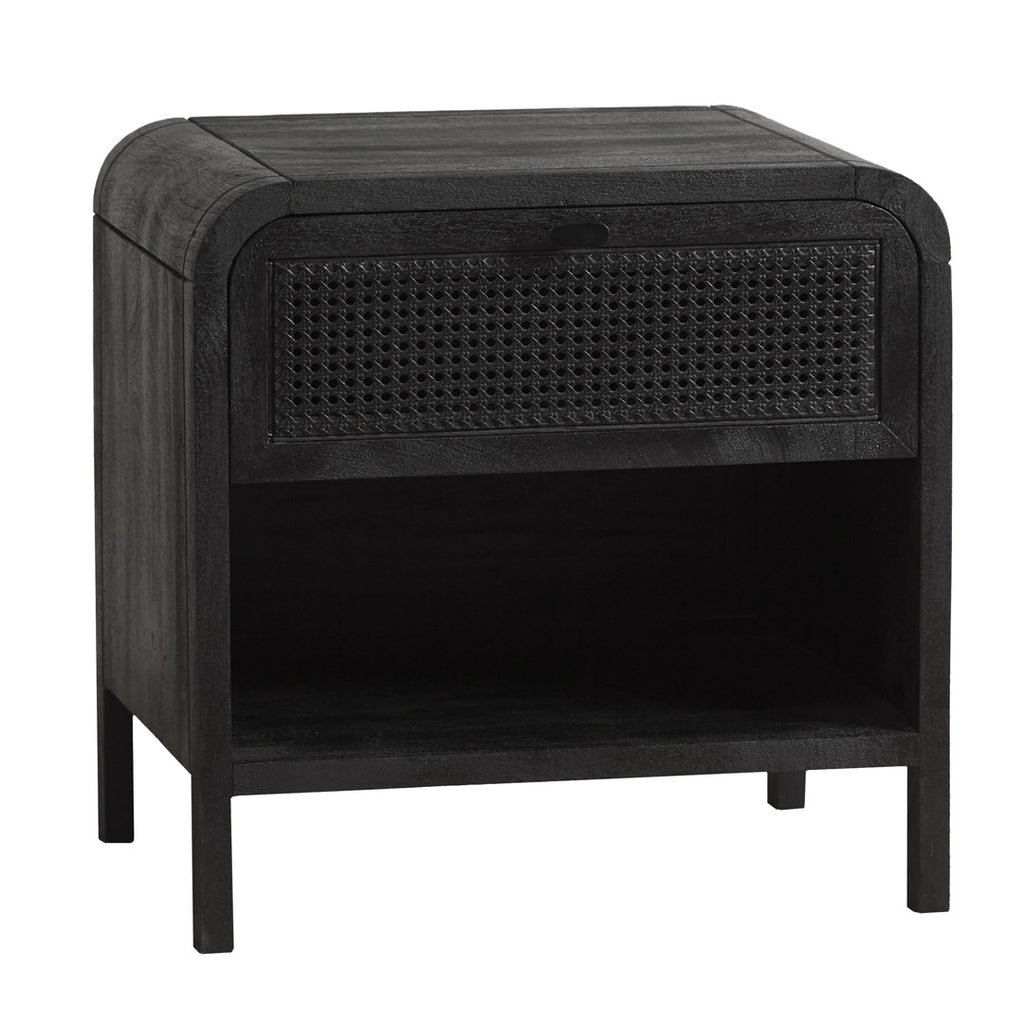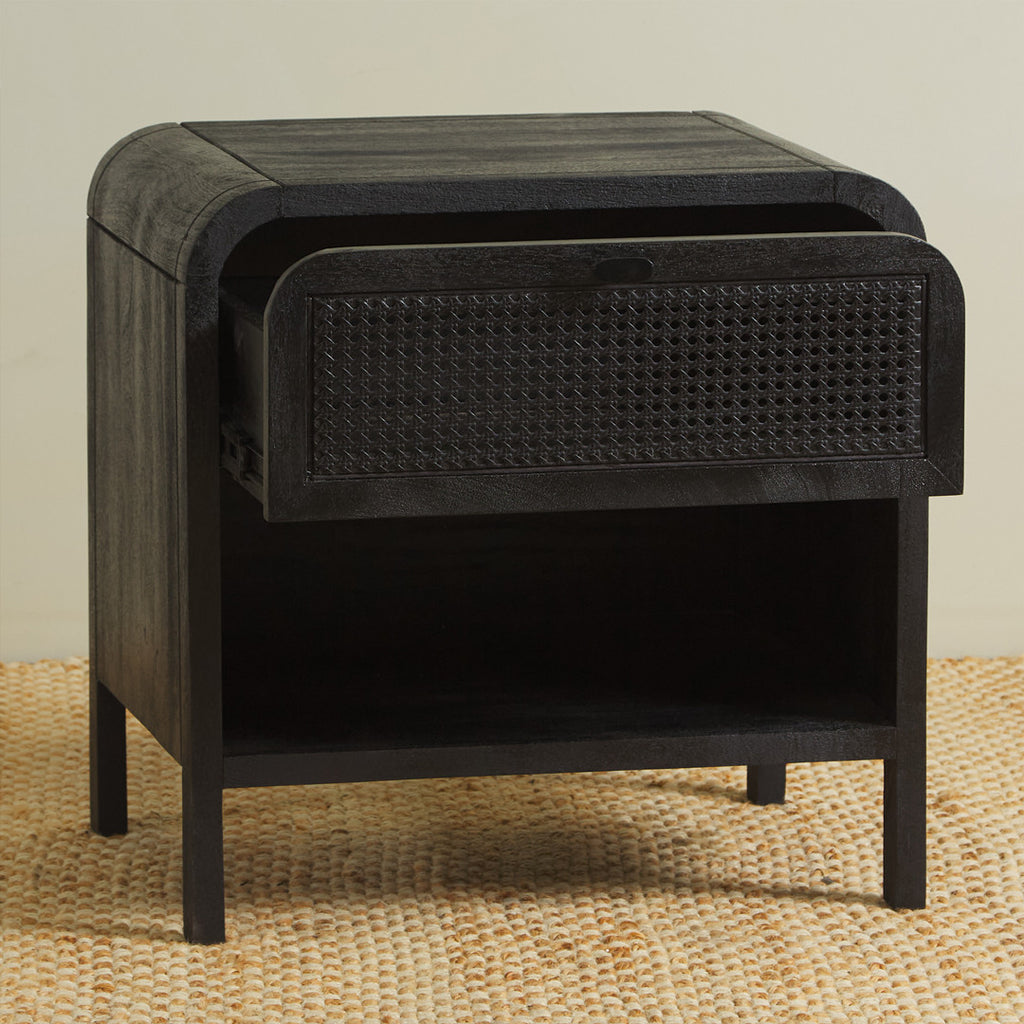 The Soho Bedside Table in black features a beautifully curved silhouette, crafted from stained black wood that showcases the natural wood grain, complemented by a striking black rattan drawer front for a touch of texture and elegance.
