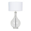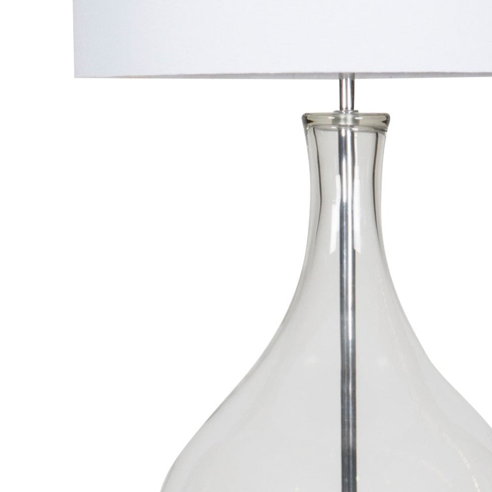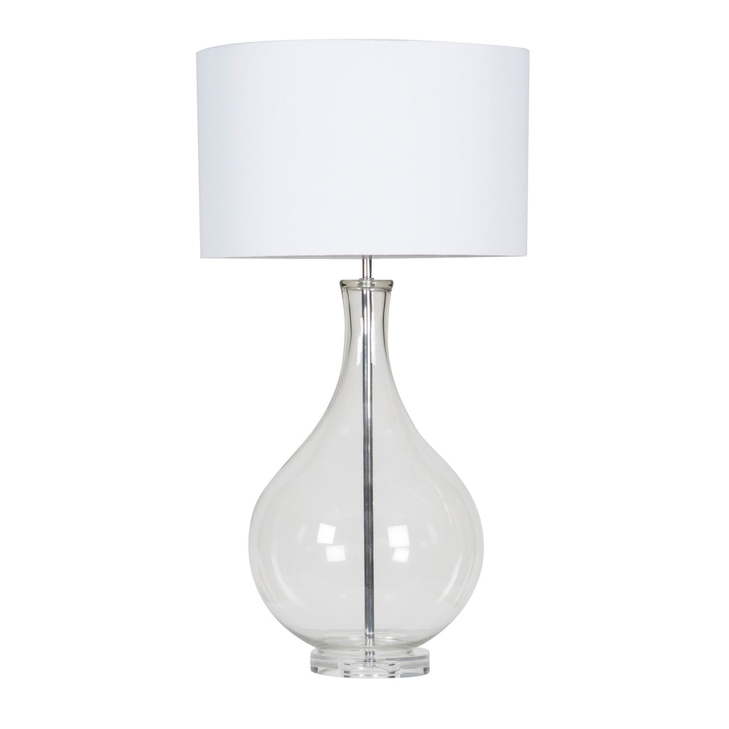 It features a silver rod down the centre and an acrylic base, giving the lamp a modern twist. It comes with a white drum shade.