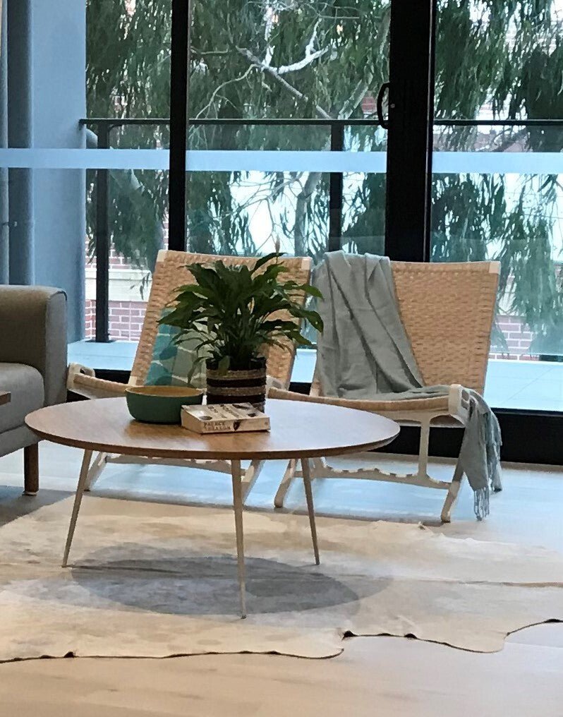 Rattan seat available in various colors (natural pictured). Also available in colors that communicate optimism — think terra cotta, mustard, rich green and brass.