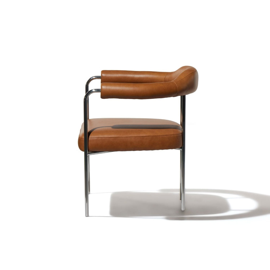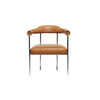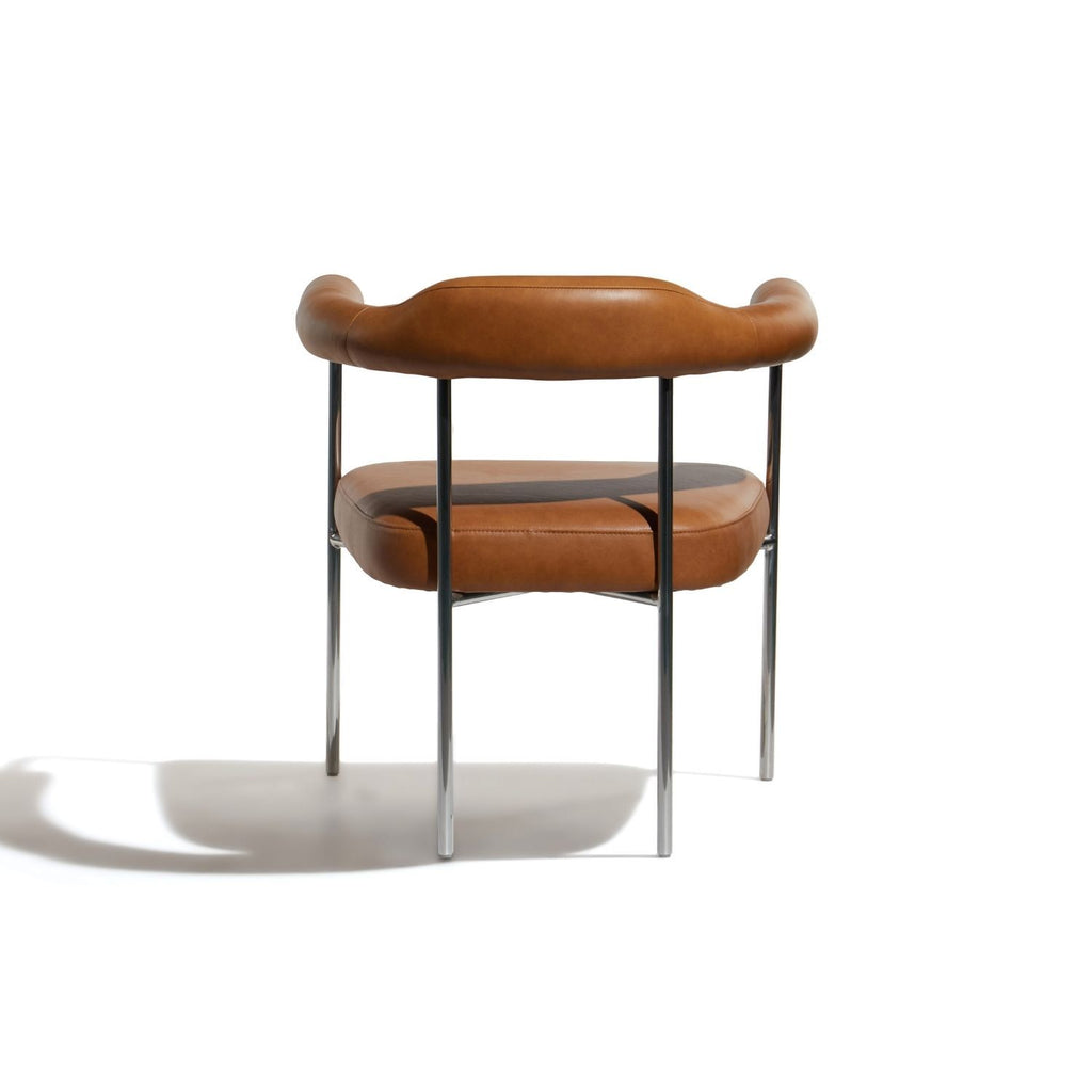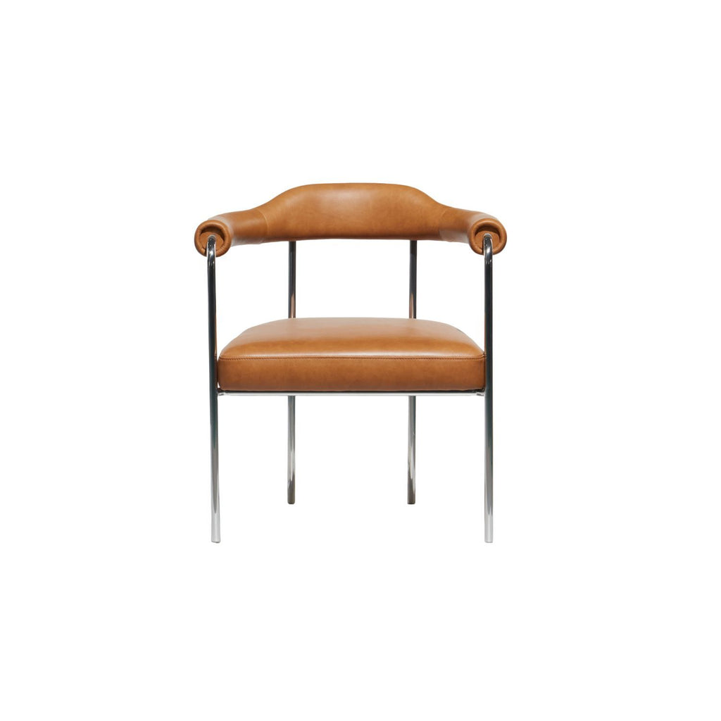 Featuring a light brown leather seat and back cushion, it offers a warm and inviting touch while delivering exceptional comfort. The polished stainless steel frame enhances the chair’s modern appeal, providing sturdy support and a sophisticated finish. Thoughtfully designed armrests add an extra layer of comfort, making it perfect for long, leisurely dining experiences.