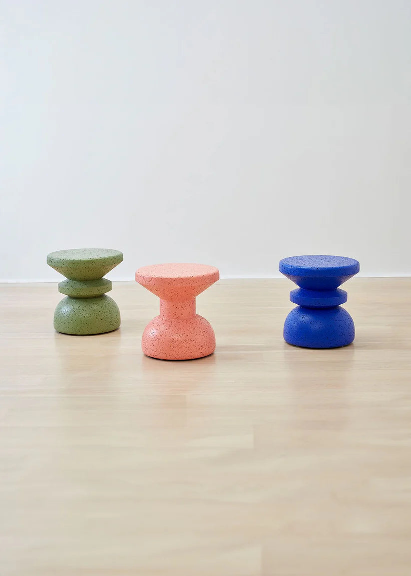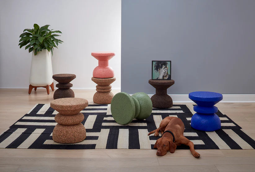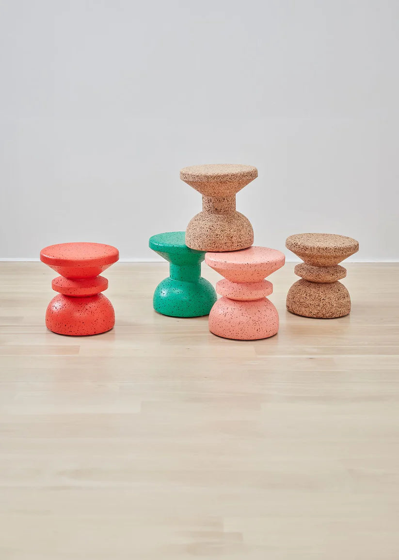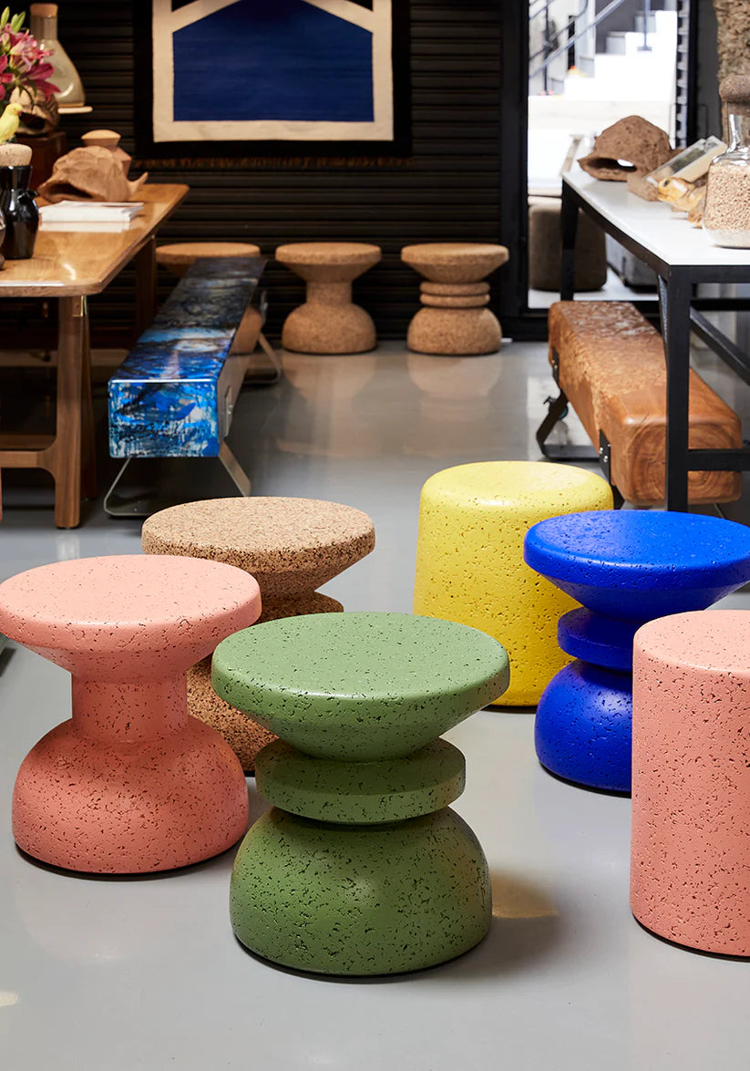 The various painted finishes make each stool unique and place emphasis on the beautiful texture of cork as a material. Every piece is made from organic, recyclable dark cork, and painted with a durable primer and water-based acrylic topcoats.