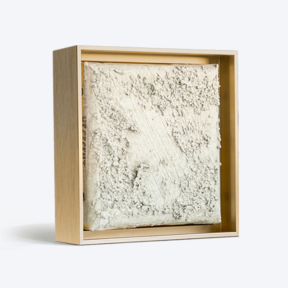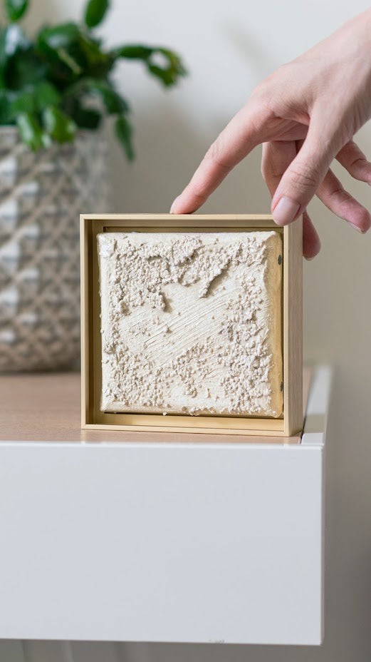 Minimalistic sculptured Earth Series crafted from earth's gifts, such as hand-picked sand and natural mineral pigments, combined with reclaimed materials found in urban areas - from discarded wood to stone powder.