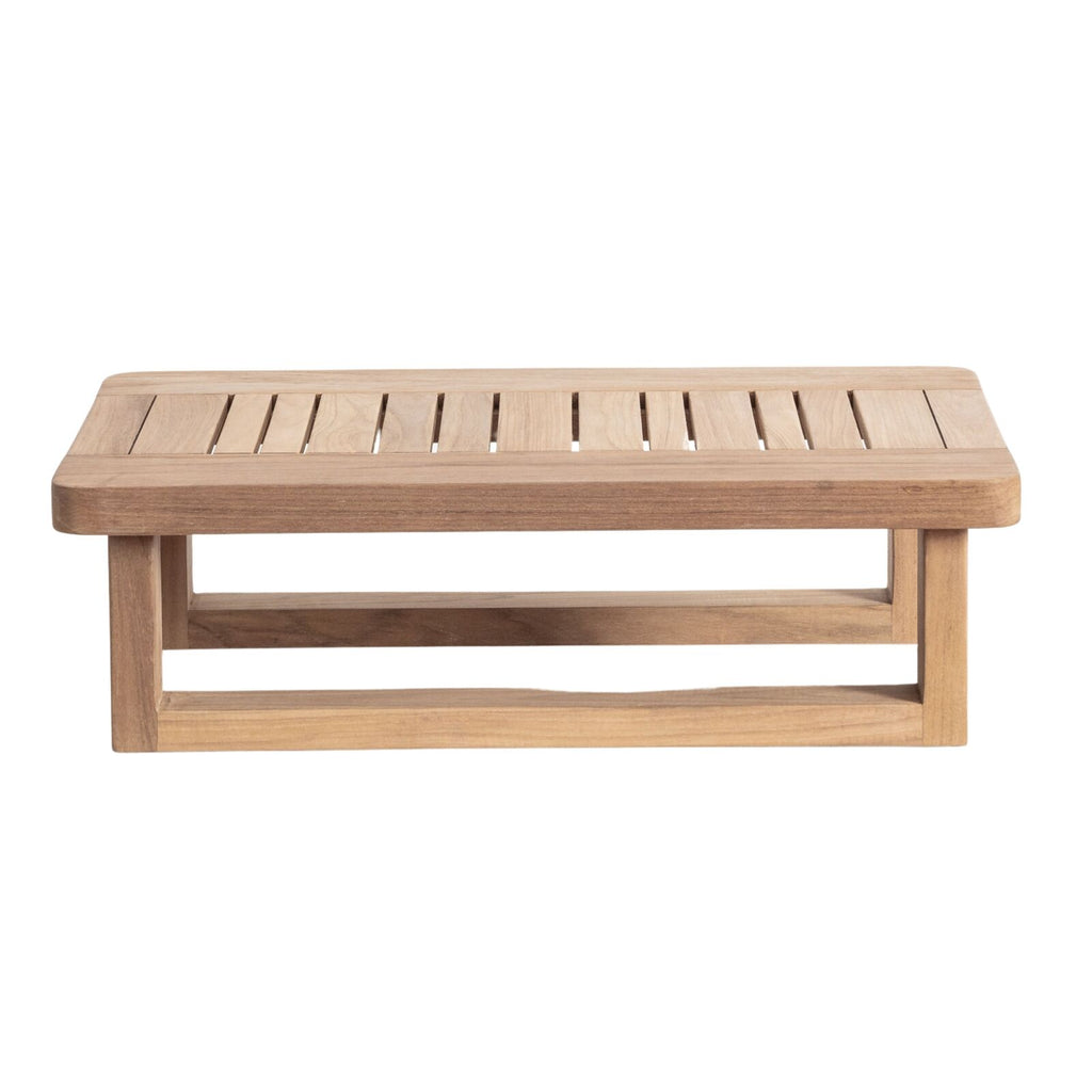 The Norfolk Rectangular Coffee Table, a stunning outdoor centerpiece with a refined teak finish enhanced by a protective Teakshield coating.