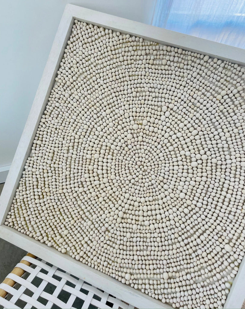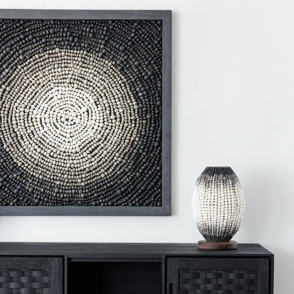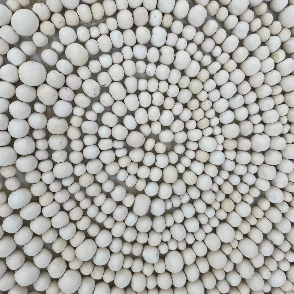 Drawing on African heritage and craftsmanship, each clay bead is hand rolled using raw clay. They are then sun dried, kiln fired and dip-dyed and in the case of our lights, masterfully strung onto its unique iron frame. This hand made process ensures that no two pieces will ever be the same.