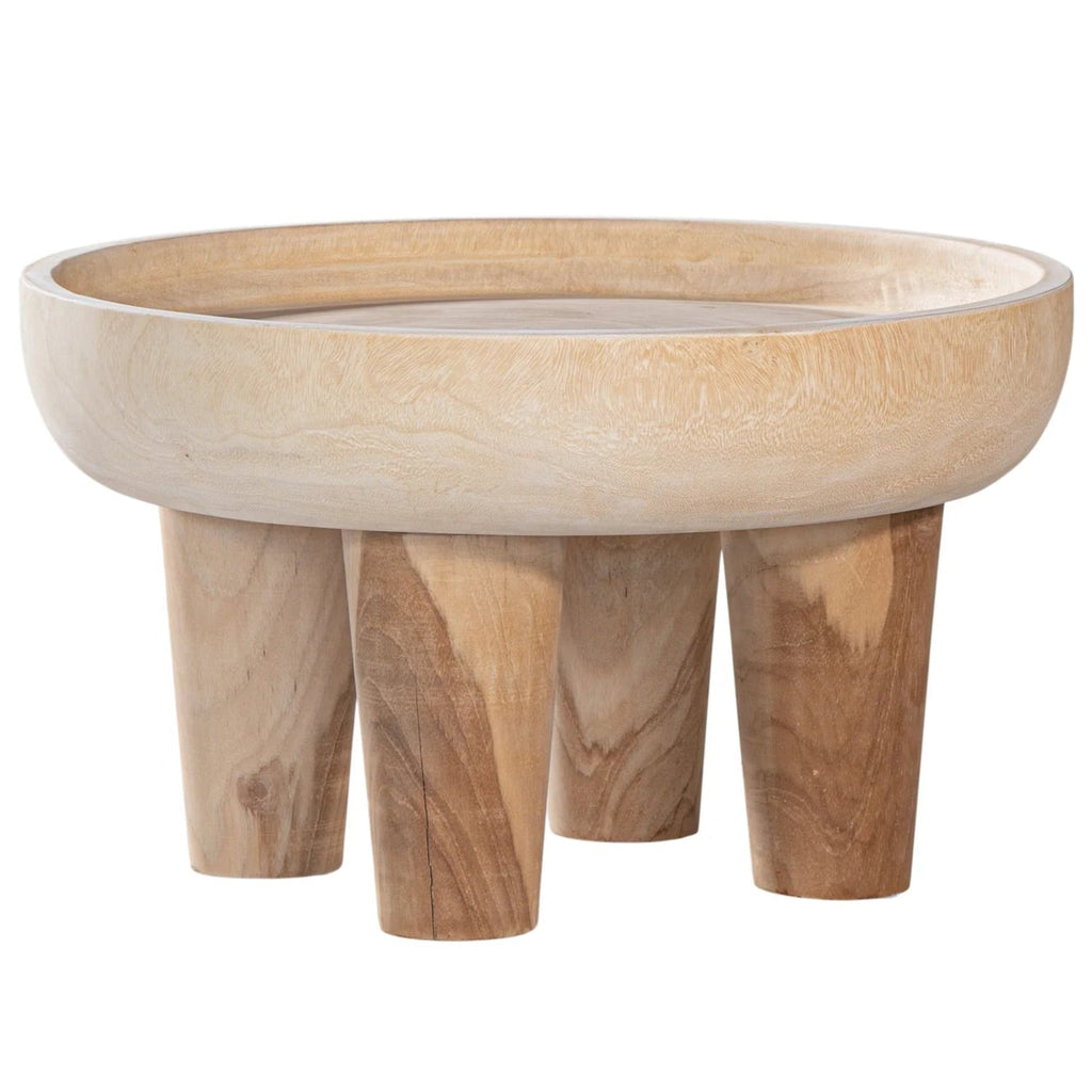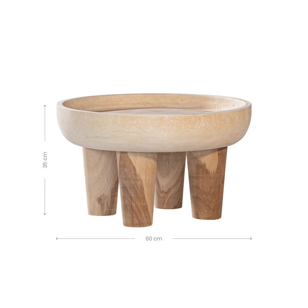 The table features a tray-like top supported by four rounded legs, each crafted from the natural trunk of the wood. Every piece is unique, highlighting the distinctive characteristics of the munggur wood.