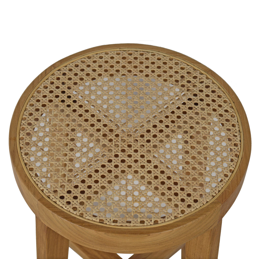 The Vienna Bar Stool features a rattan seat, offering both style and comfort.