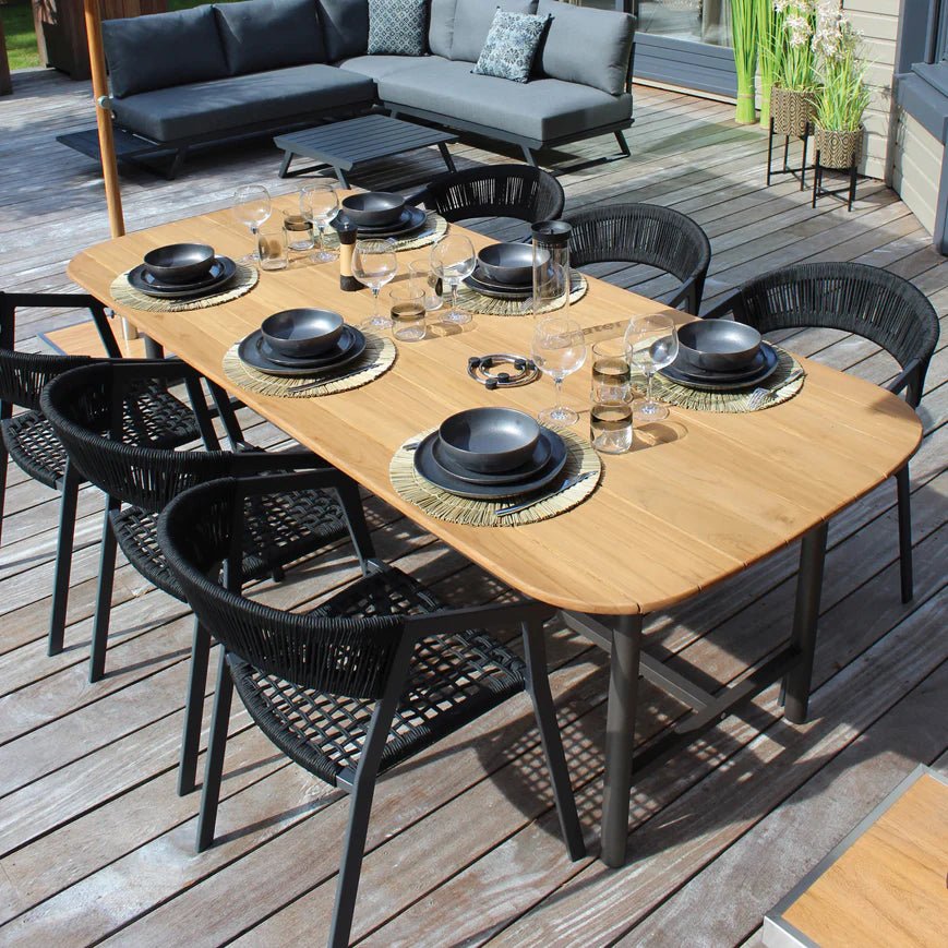 Braided in polyester cord, this black armchair stands out from classic garden furniture thanks to its refined and airy look. A sunny meal? Complete your garden furniture with the dining table to accommodate all your guests.