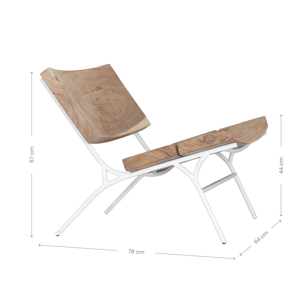 • Material: Hand-carved solid munggur wood seat in a natural finish. Powder-coated iron legs
